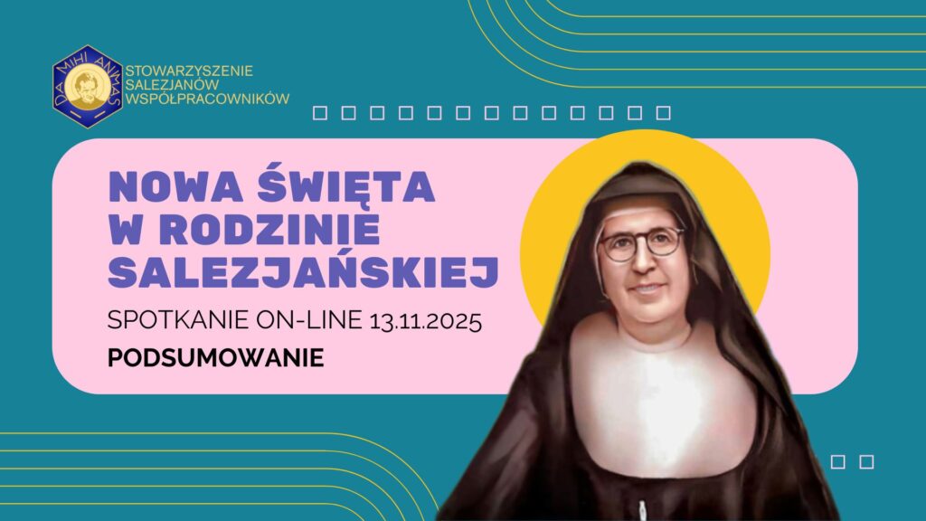 Facebook-f Instagram Youtube o nas aktualności kalendarz formacja dokumenty galeria DOŁĄCZ KONTAKT PODSUMOWANIE SPOTKANIA ON-LINE 13-11-2025 Czwartkowy wieczór 13 listopada 2025 r. był szczególnym czasem jedności i współodpowiedzialności w Rodzinie Salezjańskiej. W spotkaniu online wzięło udział blisko pięćdziesięcioro członków i sympatyków Stowarzyszenia Salezjanów Współpracowników – z czterech prowincji: wrocławskiej, krakowskiej, pilskiej i warszawskiej. Tak szeroka […]
