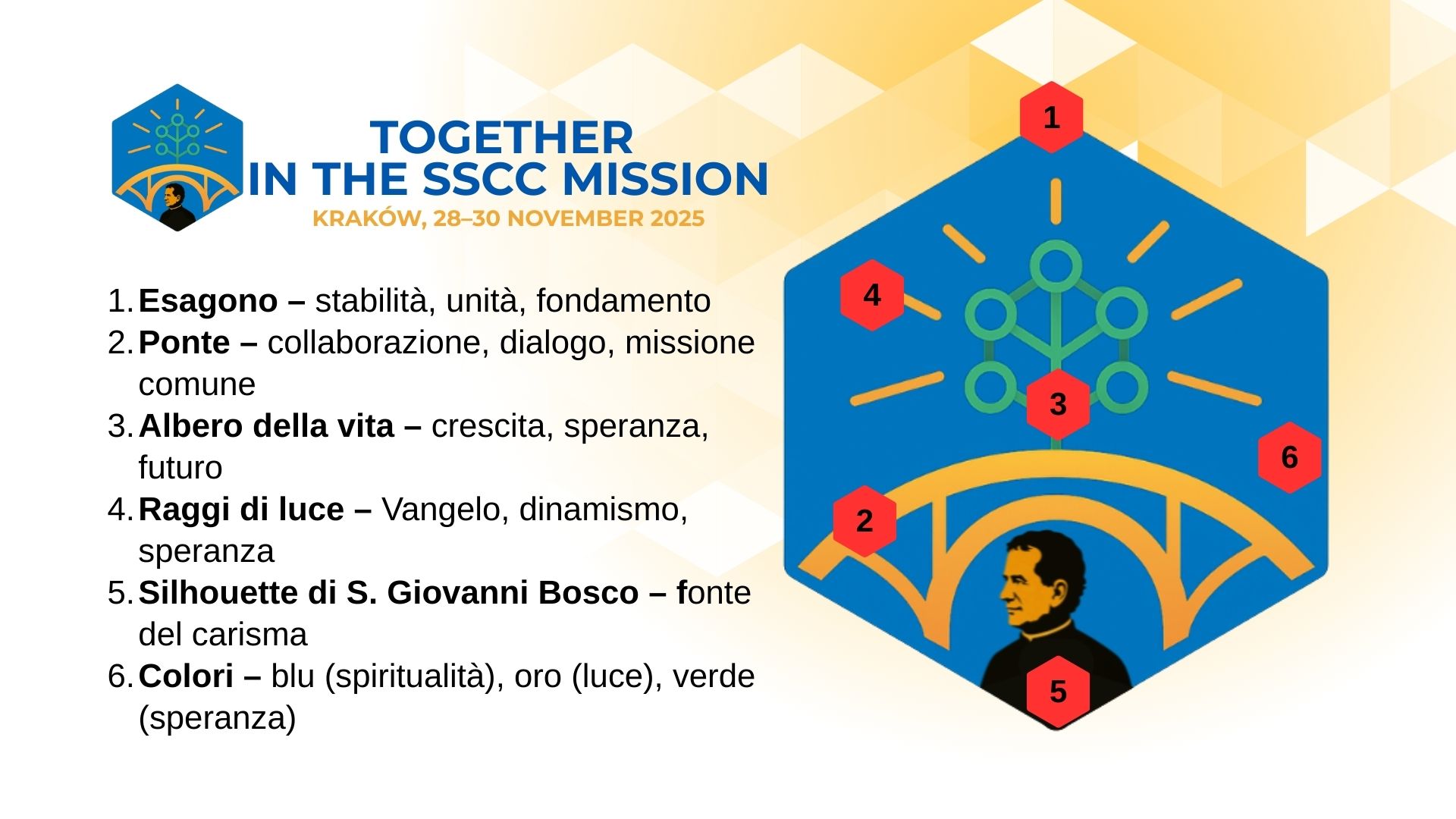 La simbologia del Congresso rappresenta unità, collaborazione e radicamento nel carisma di San Giovanni Bosco. L’esagono, il ponte, l’albero della vita, i raggi di luce e la presenza di Don Bosco creano l’immagine di una comunità che attinge alle sue radici e guarda coraggiosamente al futuro.
